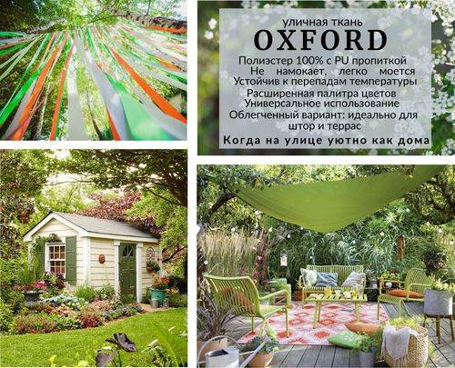 Сейчас можно с уверенностью сказать, что области применения универсальной ткани Oxford весьма разнообразны: интерьерная и уличная мебель, разного рода тенты и навесы, туристическое снаряжение, сумки, коляски, верхняя одежда и обувь, а также многое и многое другое. А в случае с Oxford 300D, материал отлично подходит для использования на разного рода террасах, за счет своей легкости и невысокой плотности с сохранением всех влаго- и ветро- стойких свойств: